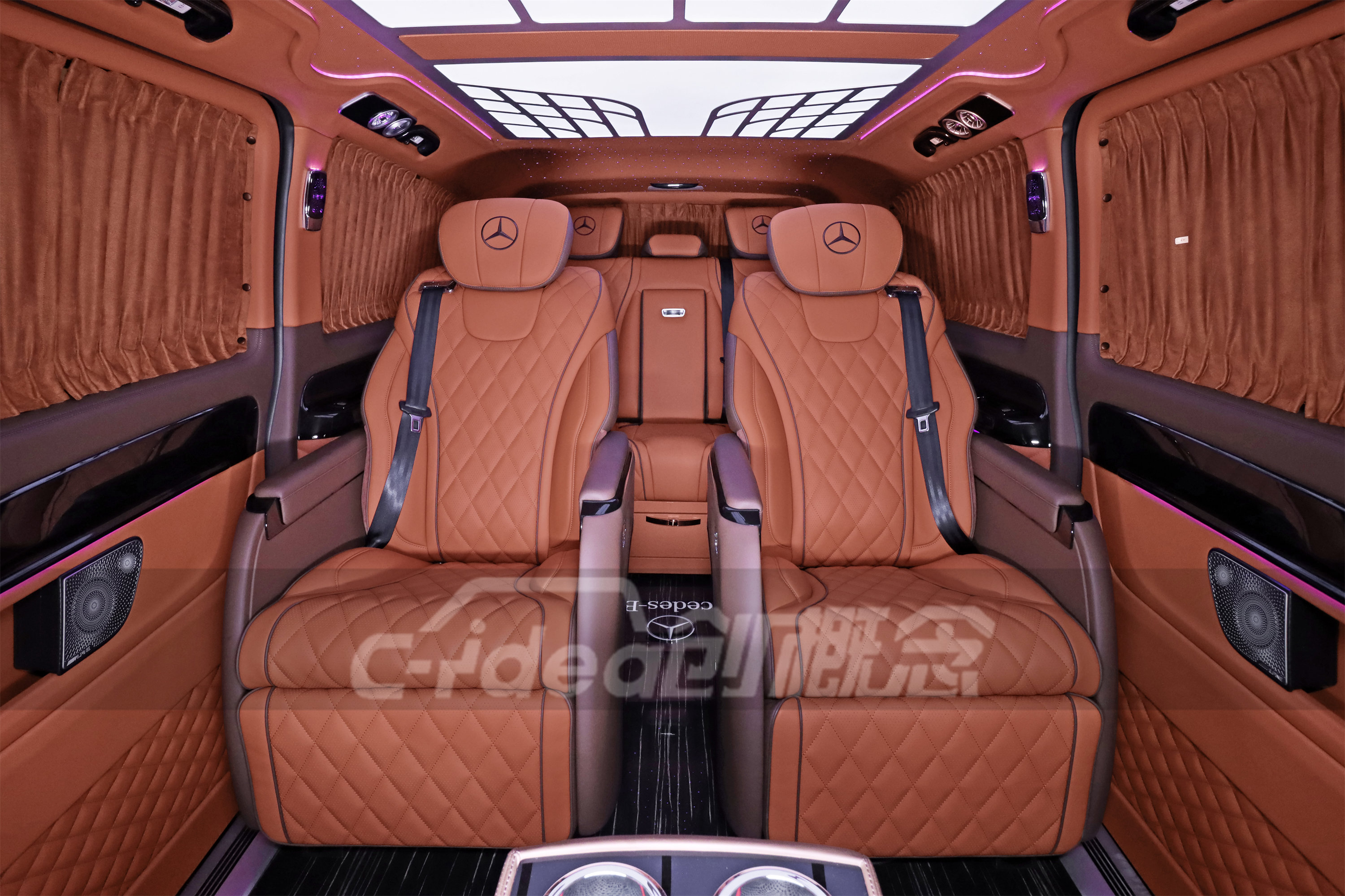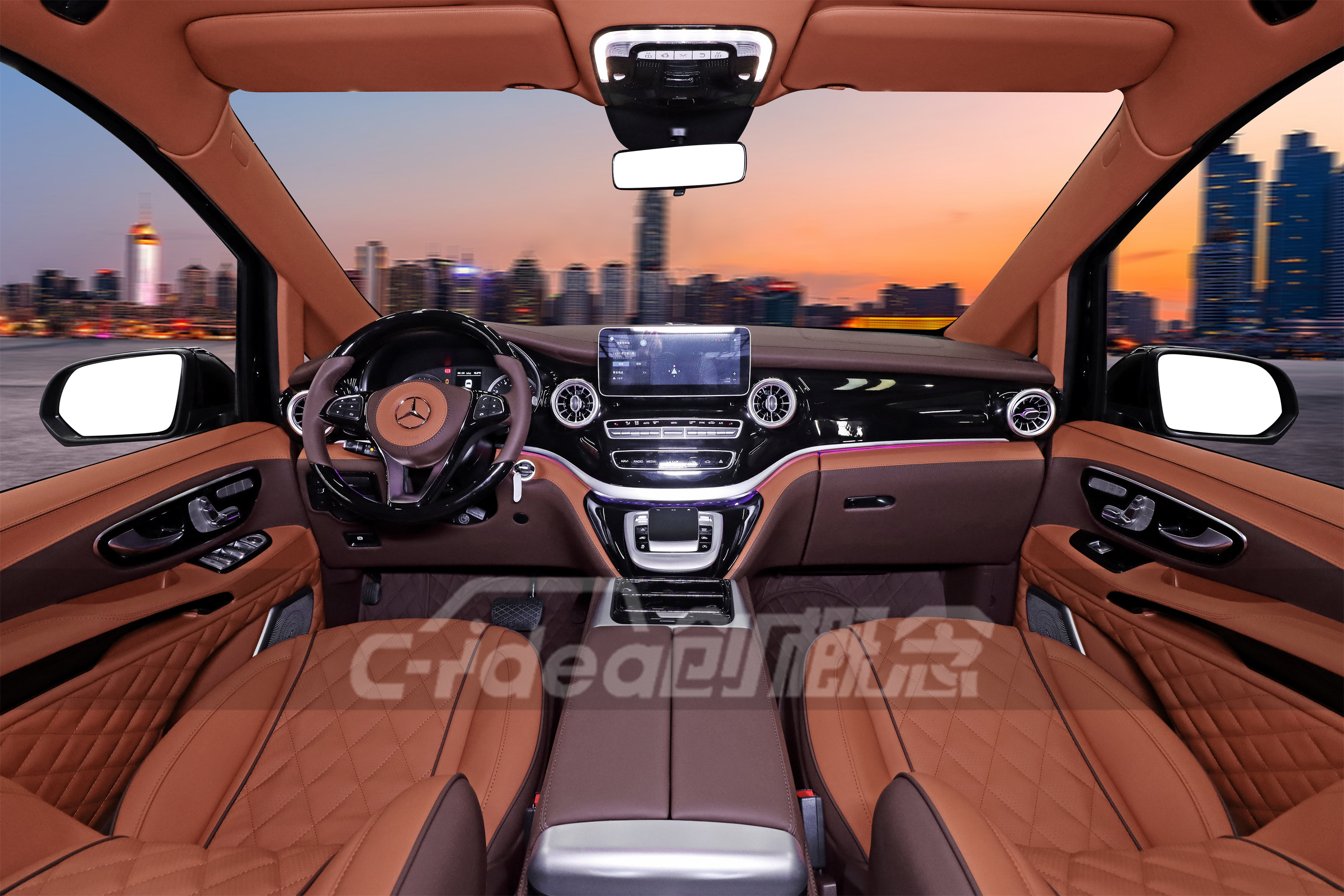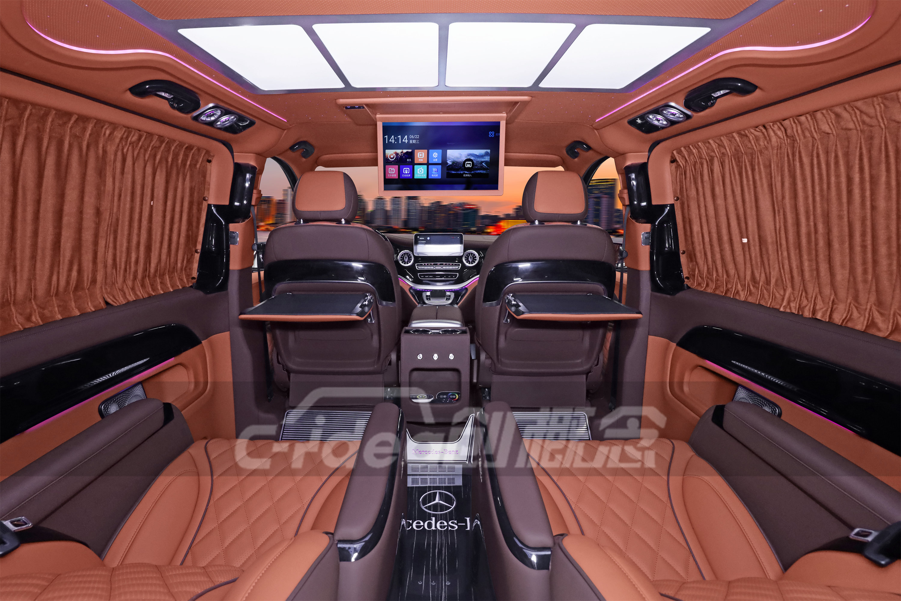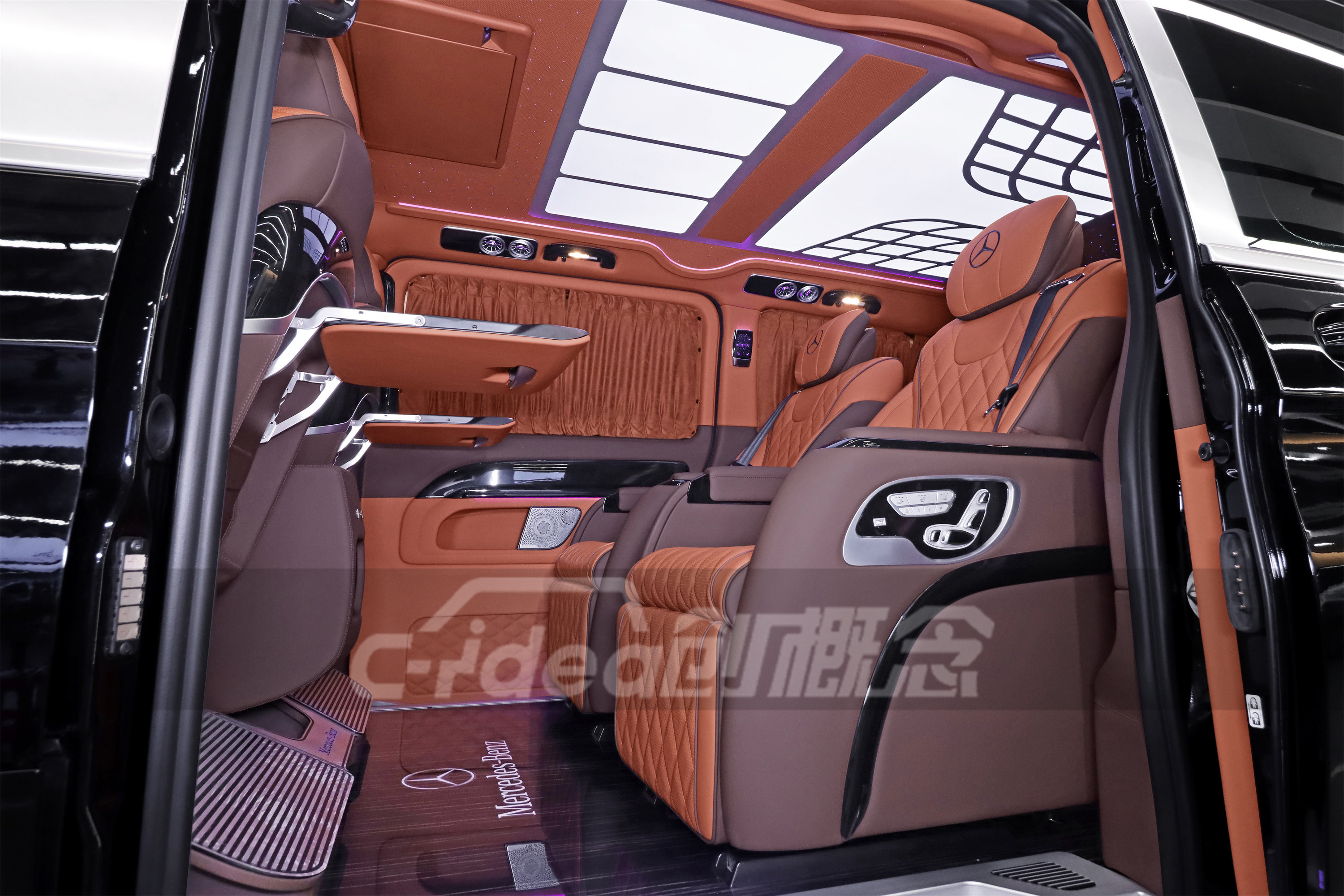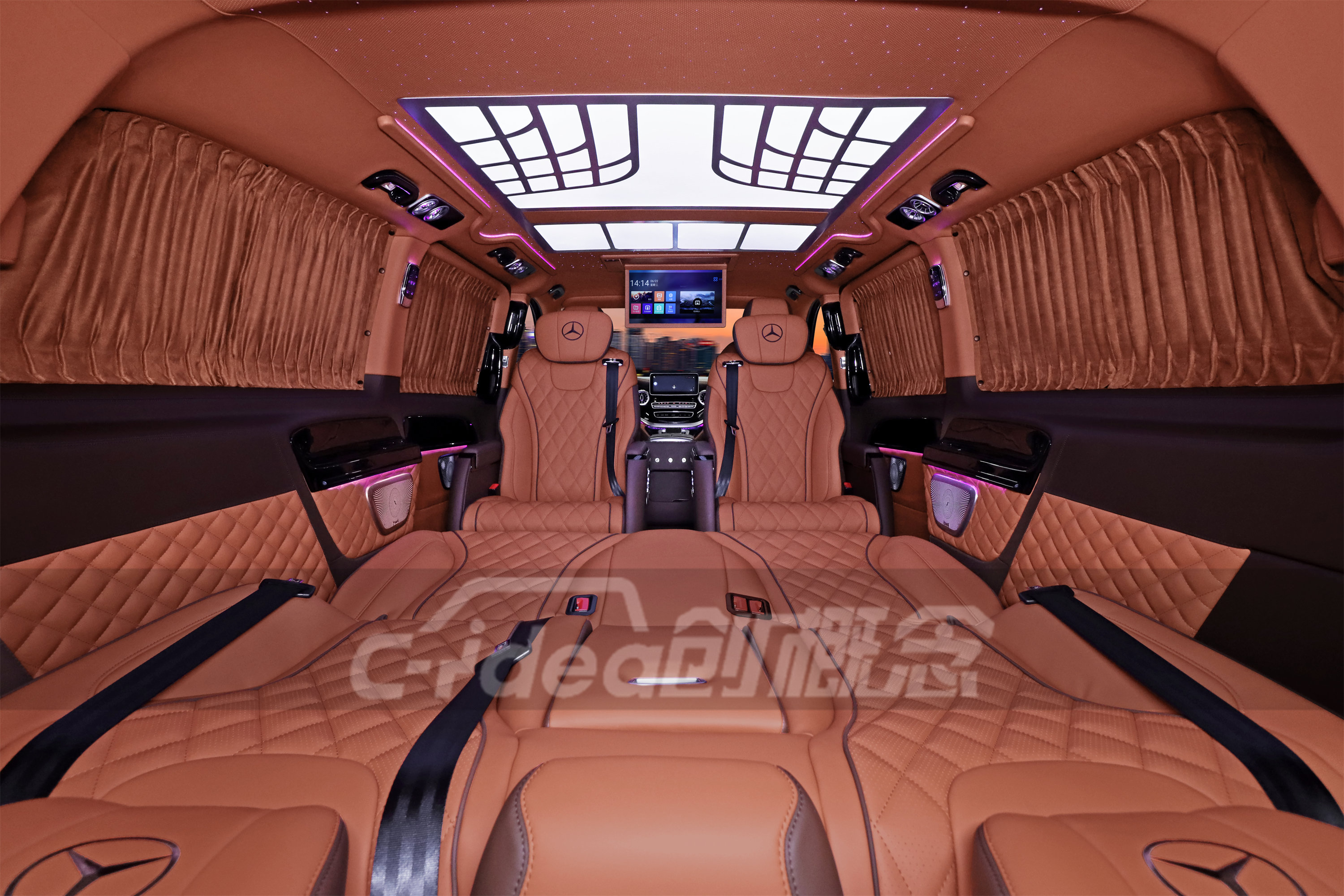 全车采用双色纳帕皮包覆,为内饰增加了时尚的元素。高端纳帕皮整车包裹,质感的细腻用指尖轻轻触碰就能感受得到。将威霆原车的仪表台更换成V260新款大连屏加装360全景雷达旋涡带灯式出风口,豪华一体式桃木镶嵌装饰,更显档次。马鞍扶手处改装成扶手冰箱,让您在炎炎夏日里能够来上一杯冰冰凉凉的冷饮解暑。