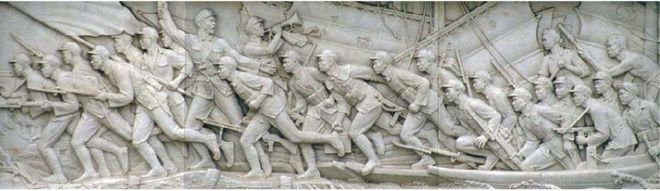 表现中国共产党的一共有三个画面,第一个是南昌起义,第二个就是抗日太行,第三个是渡江战役。最正面那幅大的浮雕是渡江战役,等于占了别的浮雕的两个的位置。这三个重要的历史事件,父亲都是军事指挥负责人。