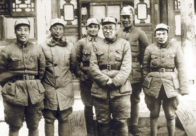 磁、武、涉、林反顽战役胜利后,一二九师领导在涉县合影。左起:李达、聂荣臻、邓小平、刘伯承、吕正操、蔡树藩(供图/刘蒙)