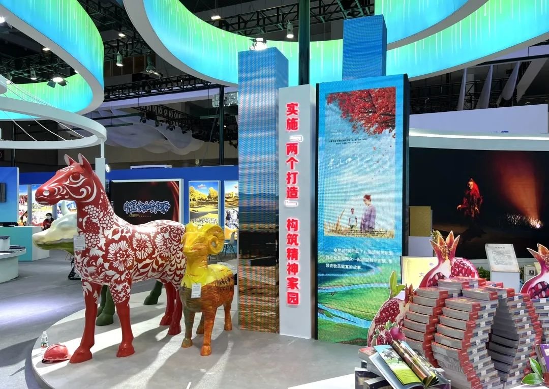 内蒙古积极打造更多政治性强、内涵丰富、意蕴厚重、接受度高的中文化符号和中华民族形象,打造具有中华文化底蕴、汲取各民族文化营养、融合现代文明的书籍、舞台艺术作品、影视作品、美术作品。展区运用视频柱、石榴形书花、歌舞大屏、传统技艺互动等形式,展示了近年来通过“两个打造”、构筑各民族共有精神家园的累累成果。