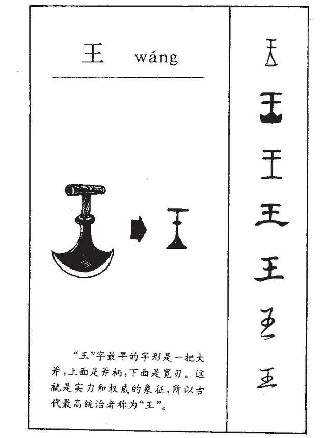 甲骨文中的“王”,直接且凶狠,就是一把斧头的象形,意为掌握这把凶器者为王,所谓枪杆子里面出政权。以斧钺为权力象征,在上古考古中屡屡出现,早已人尽皆知,因此夏朝时想必已有掌握斧钺者为最高统治者的意思,但有没有“王”这个字,如今还不能确定。