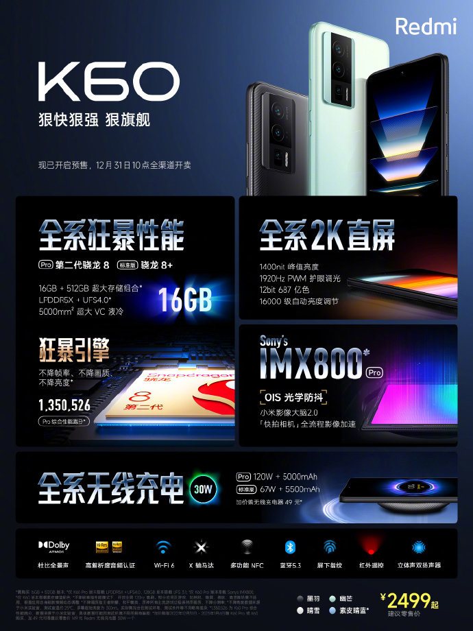 Redmi K60 Pro 搭载高通骁龙 8 Gen 2 处理器、LPDDR5X 内存、UFS 4.0 闪存,最高支持 16GB + 512GB,还配备 5000mm² 超大 VC 散热,搭载“不降帧率、不降画质、不降亮度”的狂暴引擎。