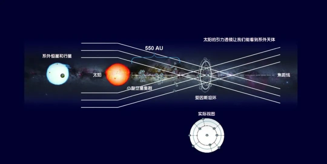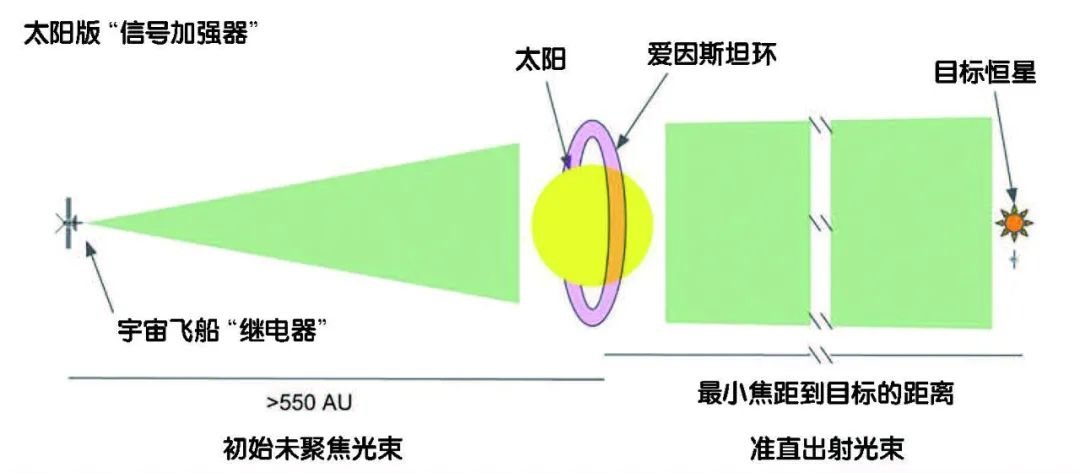 将信号接收器放置在太阳引力透镜的焦点处,目标恒星隐藏在太阳身后,当位于目标恒星附近的信号发射器发射信号时,太阳会用引力将这些信号聚焦到信号接收器上。接收到信号后,信号接收器可以将信息传递到地球,或将信号发送到另一个位于太阳周围的发射器或接收器,该发射器/接收器与另一颗遥远的目标恒星对齐,以向前转发信号。与另一个恒星系统的连接,需要另一艘驻扎在遥远目标恒星周围的信号飞船,就这样一环扣一环,一个庞大的星系通讯网络就建成了。