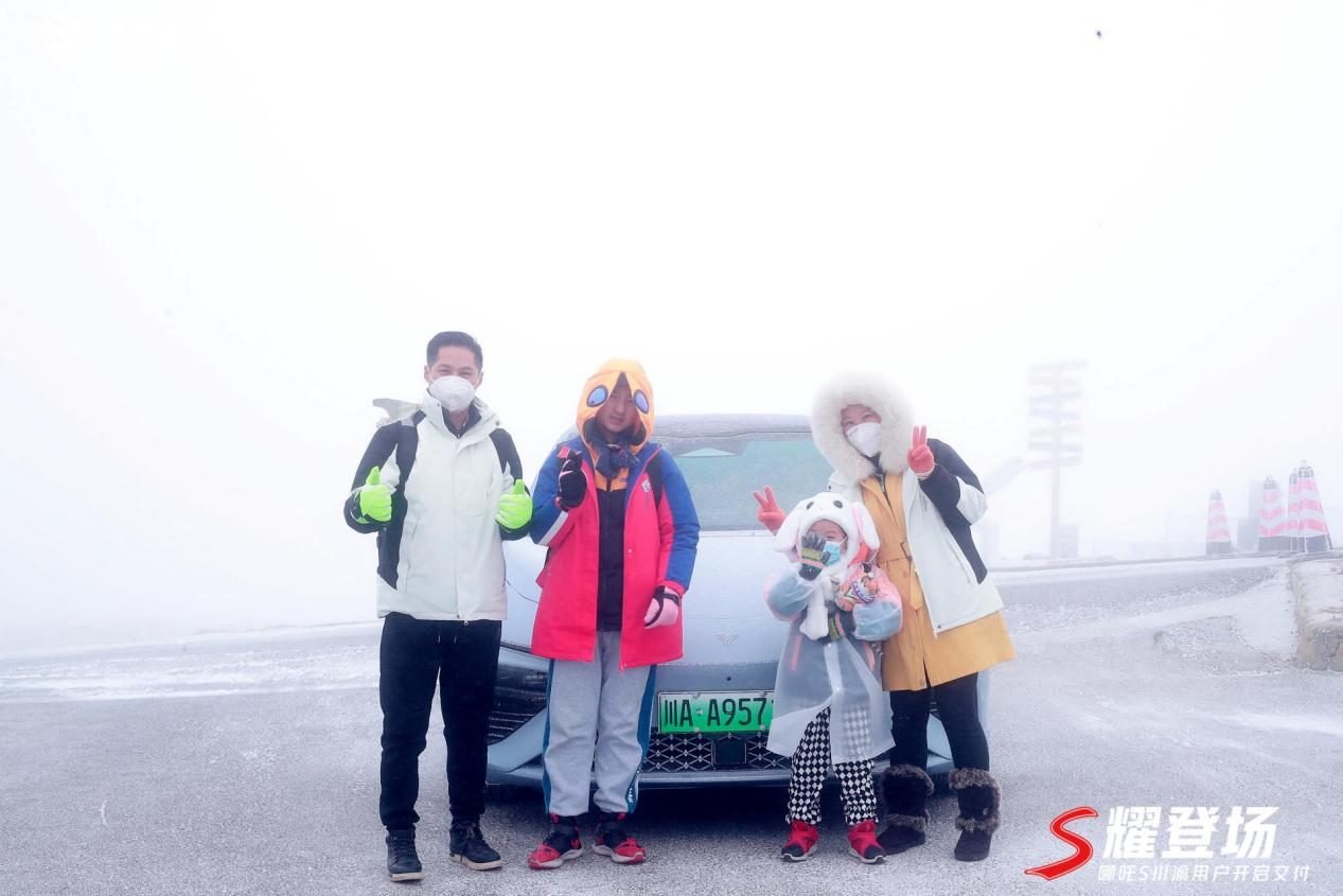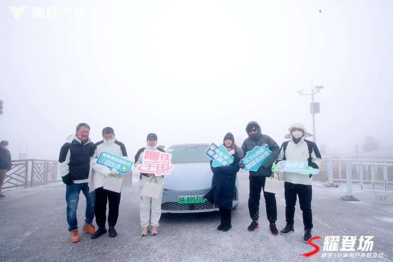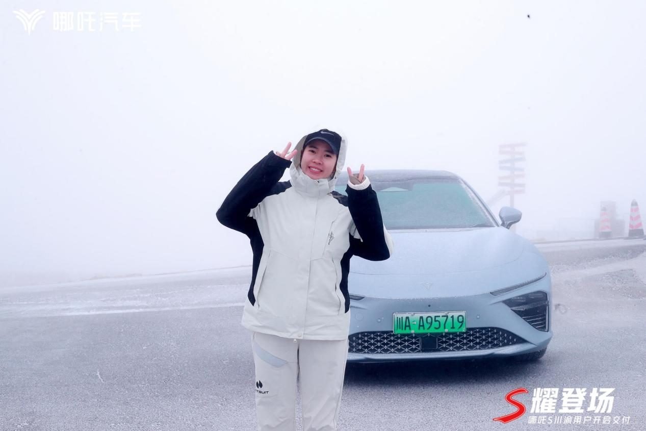山上的天气变幻莫测,云卷云舒只在一瞬间。第二天一觉醒来,原本是看日出的最佳时机,但天公不作美。整座山都被浓浓的大雾笼罩着,而且还稀稀落落的下起了雪,气温很低,路面泛白,一半是冰、一半是雪。原本“雪山之巅、云海之边、旭日东升、缘定终生”的哪吒S首批用户交付仪式,从浪漫变成了朦胧。但几位用户依然很开心,哪吒S车主邓女士说:“海拔3666米,见证了我的独一无二。”