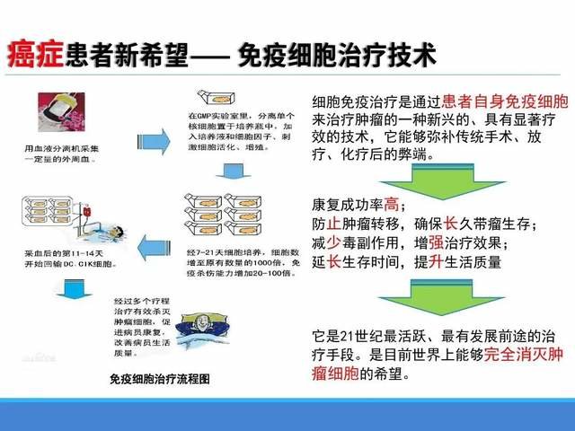 如今的癌症治疗已经进入免疫细胞治疗时代,多个临床结果证明,细胞免疫疗法可以为患者带来更多的生存益处,在启动特异性、主动性的重要自体免疫细胞,可直接标靶性地攻击与破坏手术后残留之特定癌细胞,进而提高疗效,并缓和手术后如放疗和化疗带来的毒副作用,有效延长病人生命的同时,提高病人生存期的生活质量。