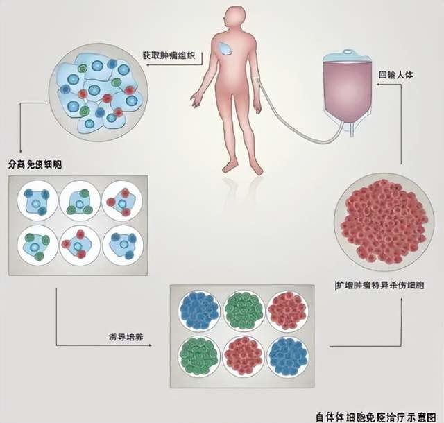 免疫细胞治疗,通过增殖、增强并激活癌症患者的免疫细胞,控制癌肿发展,改善患者体内肿瘤微环境,调整免疫系统功能及各细胞因子的水平从而抑制肿瘤发展,诱导癌细胞凋。