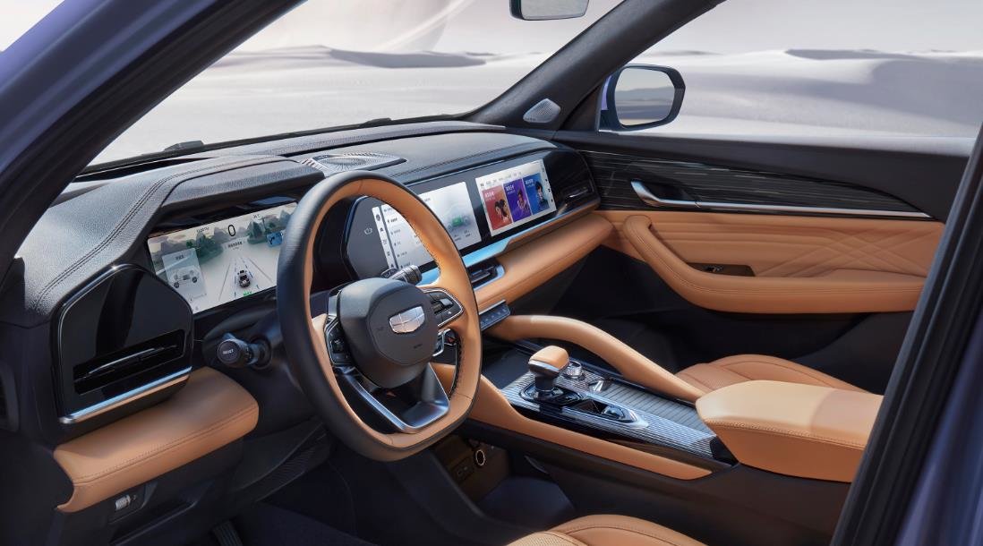 全车3个12.3英寸的液晶屏幕,科技感十足,车机系统搭载了吉利全新银河OS系统,配备高通骁龙8155车规级芯片,流畅性和易用度都令人满意,游艇式电子换挡杆以及多功能真皮方向盘,增加了内饰的科技感与豪华气息。