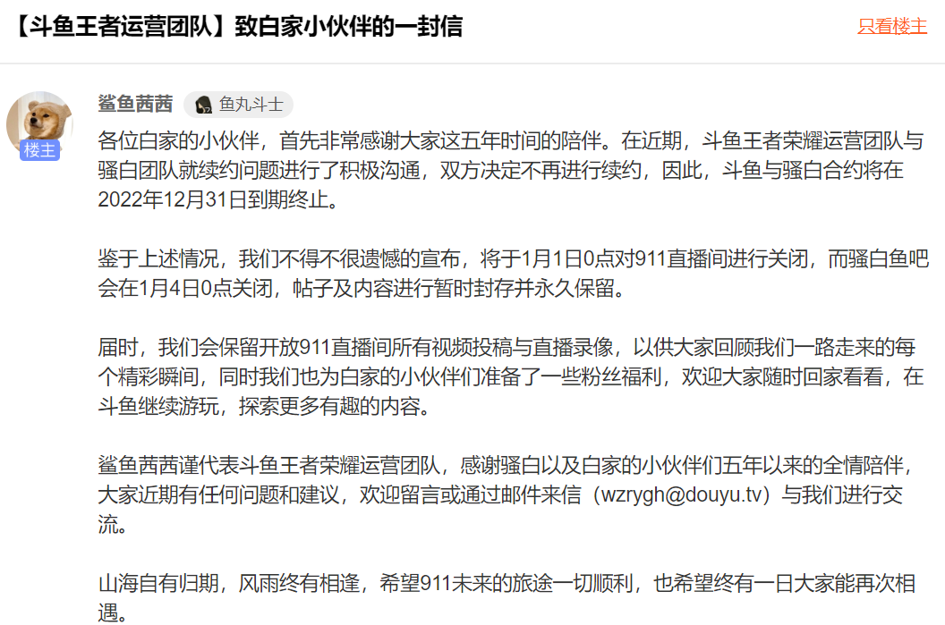 斗鱼官方公告表示,911直播间会在1月1日凌晨关闭,骚白的鱼吧会在1月4日关闭,不过斗鱼并未抹去骚白在此平台留下的所有印记。每一个主播都会在平台上发布一些小视频或者是直播录像,这些都是骚白在斗鱼平台留下的回忆,骚白和官方表示不会删除这些内容,玩家依旧可以来到斗鱼平台继续观看曾经的视频或者直播内容回放。骚白停播期间,玩家通过直播回放依旧可以学到很多东西。