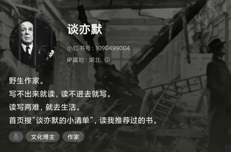 小红书读书博主谈亦默在简介中形容自己是个“野生作家”,而事实上他确实是一个有十余年写作经验的写作者,曾经出过书、获过奖,是某大学的驻校作家。