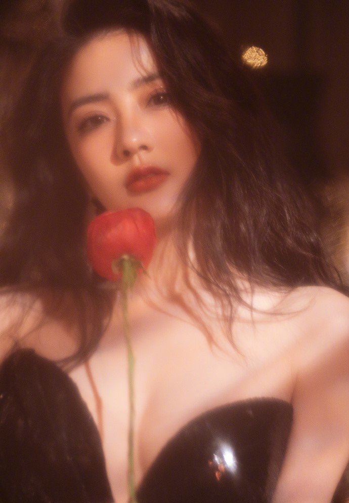 徐璐生日大片,一袭黑色亮片抹胸高开叉长裙,blingbling玫瑰美人