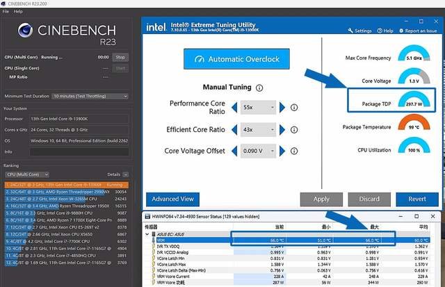 先来看看酷睿i9 13900K在ROG MAXIMUS Z790 APEX上的性能释放情况。从Cinebench R23考机情况来看,即便处理器满载功率高达300 W左右,ROG MAXIMUS Z790 APEX的VRM温度也没有超过66℃,可见豪华的VRM供电方案与散热装甲在应对酷睿i9 13900K满血释放的情况下也是完全过关的。