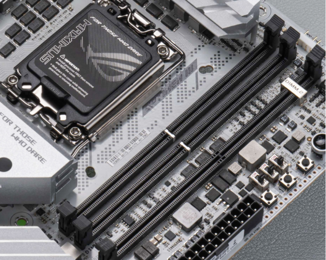 除了针对处理器超频进行强化外,ROG MAXIMUS Z790 APEX在内存超频方面也非常强大。可以看到为了提供最佳的电气性能,主板只提供了两条内存插槽,并尽可能地让插槽靠近处理器插座以减少线路上的信号损耗与干扰,因此它实测已经可支持DDR5 8000+的超高内存频率。同时,主板还支持AEMP Ⅱ(华硕增强型内存配置文件),几乎可针对所有不支持XMP的DDR5内存模组自动设置超频参数。