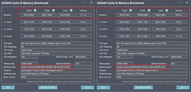 除了处理器超频,ROG MAXIMUS Z790 APEX对于DDR5内存超频也是非常擅长的。我们使用的这对DDR5 6000内存在ROG MAXIMUS Z790 APEX上简单调节了一下时序参数就很轻松地超到了DDR5 6800使用,同时还稳定地通过了AIDA 64的测试。考虑到目前主流DDR5 6000内存价格已经与DDR4 3600接近,所以装新电脑买高频DDR5内存的玩家不在少数,那么此时选择ROG MAXIMUS Z790 APEX无疑能让手中的高频DDR5内存性能直接提升一大截。从测试来看,双通道DDR5 6800的带宽已经突破100 GB/s大关,表现十分夸张。