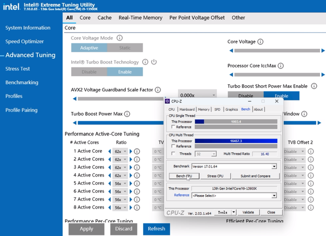 前面说过,ROG MAXIMUS Z790 APEX在设计和用料方面都做到了极致,因此电气性能极佳,即便是主流玩家的使用条件下也能实现轻松超频。从实测来看,我们仅仅是增加了0.09 V电压,即可将酷睿i9 13900K的性能核最高睿频提升到6.2 GHz,全核频率则设置为5.6 GHz。此时CPU-Z的单核得分已经高达1003.4,相比默认最高5.8 GHz时的940分百尺竿头更进一步。当然,这是在常规水冷散热器下超频的结果,而使用液氦超频的超频达人已经在ROG MAXIMUS Z790 APEX上达成了酷睿i9 13900K暴超9 GHz的纪录。所以,如果你有更加强大的散热工具,不妨放手一试!