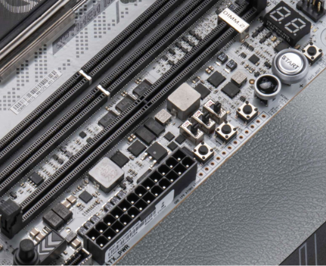 此外,这24组为处理器供电的整合式供电模组还配备了高端的105A Dr.MOS芯片,相比传统的倍相模组拥有更快的响应速度和更高的峰值电流,为挖掘处理器频率潜力提供了坚实的基础。与超强供电模组搭配的周边设计还有8Pin + 8Pin PROCOOL Ⅱ高强度供电接口、粉末化超合金电感与高磁导率电容,这些元件也让ROG MAXIMUS Z790 APEX拥有了极为出色的电气性能,把处理器高频稳定性提升到了一个极高的水平。