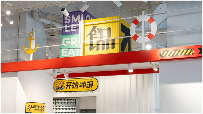 在3.0“超集货轮”主题门店中,KKV将集装箱元素进一步升级。与2.0门店对比,3.0门店将店内的场景从陆地移至海洋,置入船锚、救生圈、仪表盘、船舵、生活区甲板、码头、轮船等与航海相关的全新主题元素,经典明黄色配合海军蓝的主题色调,航海氛围感拉满。