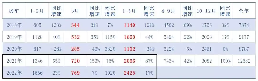 2022年即将结束,最近国内不少地区疫情反复,考验着各地的防控能力,也考验着房车行业。开年以来各地防疫政策不断严格,房车展会的数量也呈现了断崖式下跌。但根据中国汽车流通协会数据,2022年一季度房车累计销售2425辆,同比增长17%,销量在近5年同期中居最高。