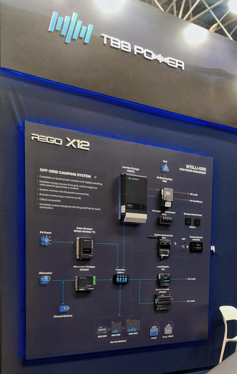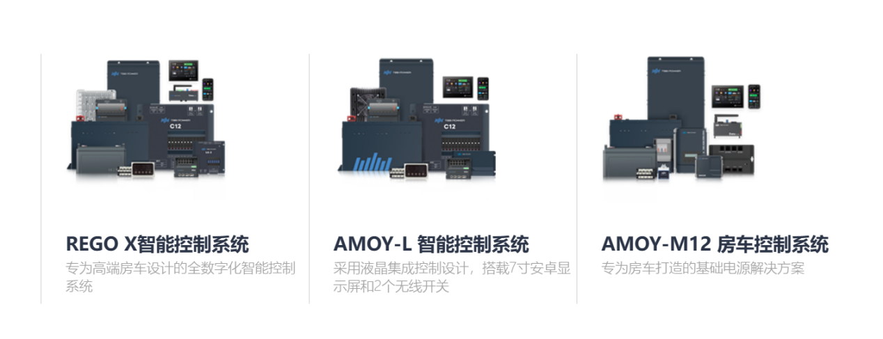 L:纵观中国的房车发展历程,开始各家房车企业都只在做前期试水,开发出几款概念车,并没有能够将房车量产落地的能力。所以在电气系统的选择和使用上可以根据车型进行电气系统的”专车定制“,也就是模块化拼装。当时TBB拓宝的逆变器在国内的装车率是相当高的,10台房车有6台里就能看到TBB拓宝的模块应用。随着房车行业发展,产量激增,也由于房车在开发生产过程中投入巨大,类似模具都需要大量资金投入,为节省研发费用,尽快投放产品,对电气系统的通用化解决方案提出了需求。因此TBB拓宝推出了AMOY通用化房车整车电气系统。在房车行业百花齐放的时期,各家有意打造更有品牌特色的有市场竞争力的产品,彼时对电气系统的个性化解决方案有了创新渴望,TBB拓宝又推出了REGO X全数字化房车整车电气系统。所以整车电气系统的设计理念是跟随房车企业、房车行业的发展变化而变化的。
