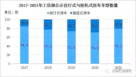 越来越多的消费者认可了房车,各大房车企业也在不断推陈出新向市场投放新产品。近年来,中国自行式房车车型保持在70款以上,拖挂式房车车型在20款左右,总体来看自行式房车车型数量远超拖挂式房车车型。2021年中国自行式房车车型79.2款,拖挂式房车车型20.8款。