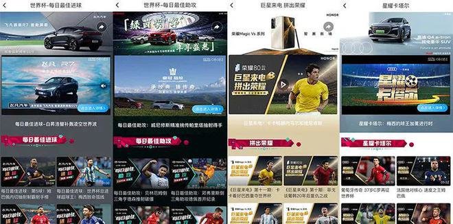 “球场高光集锦”同样持续抢占用户心智。通过“每日最佳进球”“每日最佳助攻”等精彩回顾,中国移动与飞凡汽车、一汽丰田、荣耀手机、一汽奥迪等品牌释放内容优势,引爆了传播的涟漪效应。