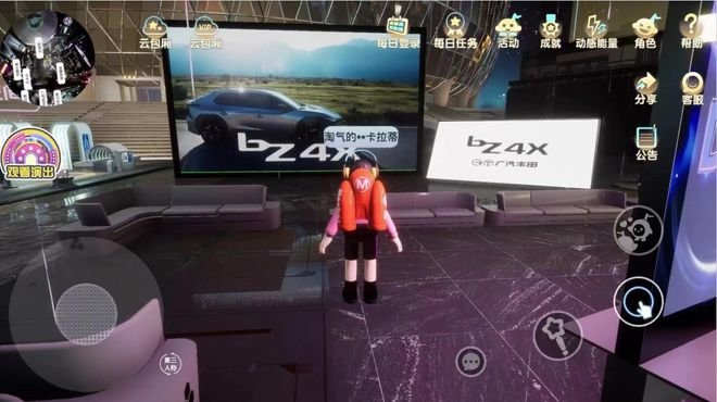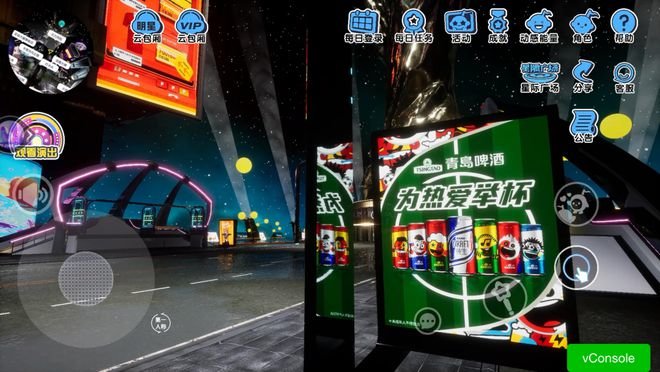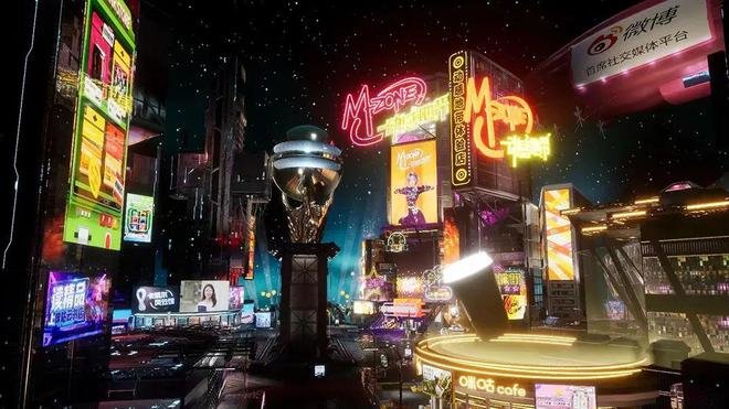 世界杯决赛前,两场在元宇宙空间星座.M上演的动感地带世界杯音乐盛典,让我们感受到了内娱绝美元宇宙舞台。在音乐盛典期间,用户点击屏幕图标就可以进入到演出现场,一个有“动感地带”大厦和三得利、广汽丰田、青岛啤酒、咪咕咖啡等品牌的赛博朋克般的拟真世界。