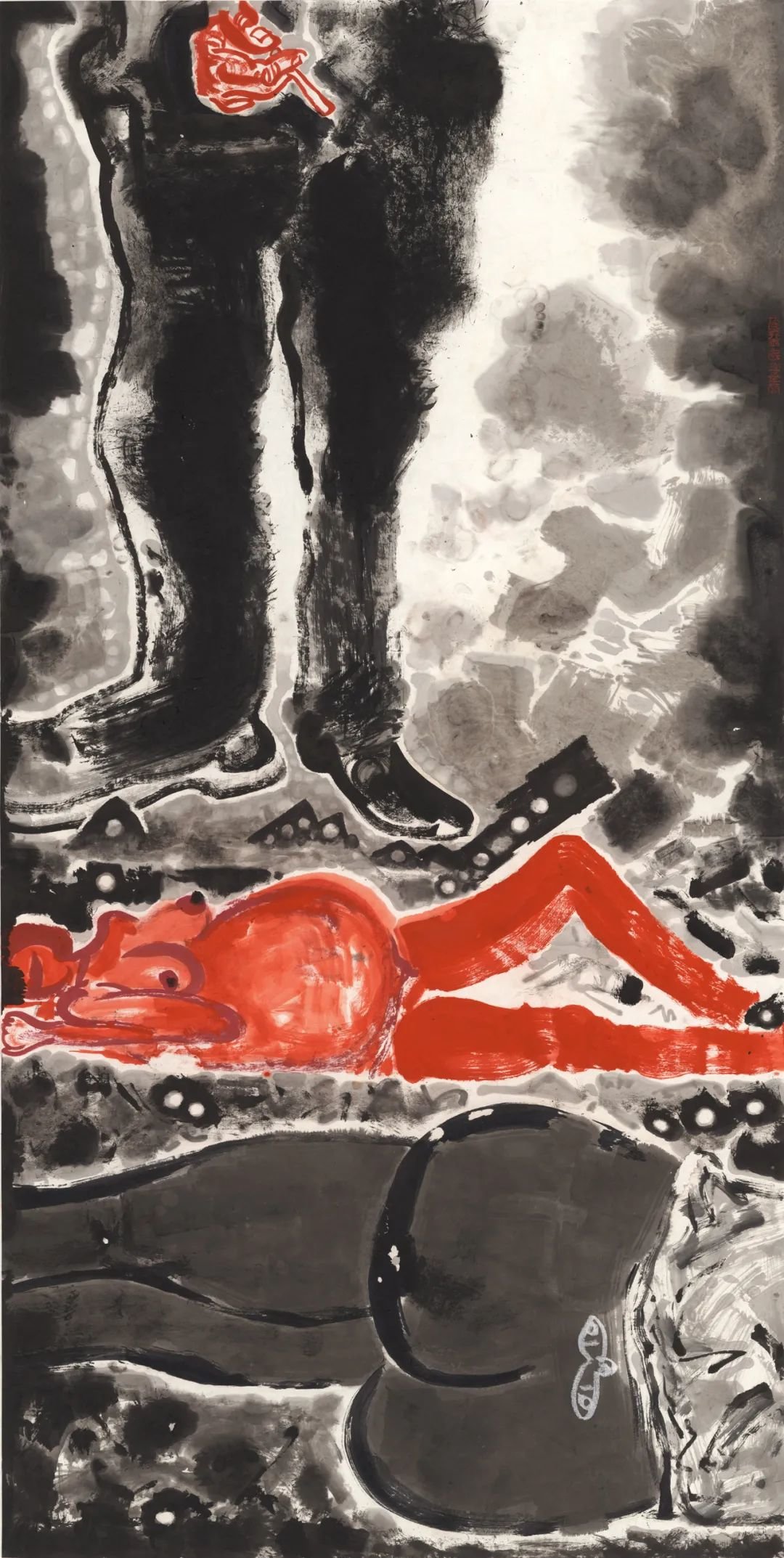 如果将20世纪水墨人物画的写实主义与表现主义作比较的话,事实上,表现主义的水墨人物画成就更大一些。徐悲鸿以后写实主义水墨只是完成了写实主义在语言上的水墨化,但没有确立水墨人物画的主体诗学。李孝萱等人的表现主义人物画,不仅解决了笔墨形式的表现主义,事实上还为水墨人物画确立了一整套现代主义的绘画诗学。比如性主题、精神分析、虚无感、喧哗与骚动的存在感、焦虑不安的情绪、现代拜金主义等。