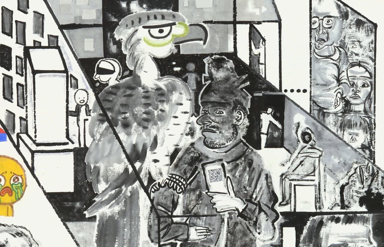 90年代的“大轿车”系列使李孝萱的人物水墨的探索获得了关注。这不仅在于大胆的机械工具的构图及通过水墨的写意笔法将机械形式的“软化”,更重要的是使人物的风格主义与“新文人画”笔墨主义的文人趣味拉开了距离。李孝萱的人物没有停留在一种市俗主义的趣味,而是被赋予了一种现代主义的救赎视角,他笔下的现代主义的群像更像是一群没有彼岸性的“游魂”,但又是以水墨语言表现出一种中国式的没有灵魂的现代性。