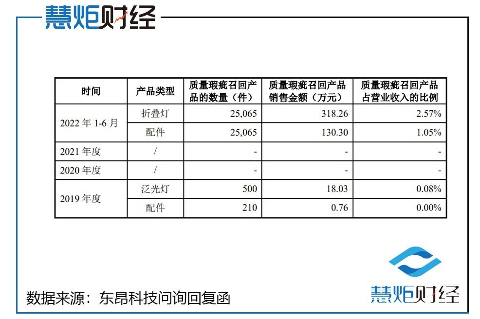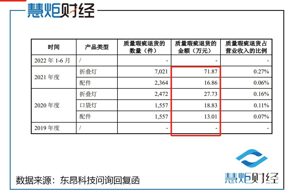 慧炬财经注意到,回复函披露,报告期内,东昂科技因产品质量瑕疵退货的金额分别为 0 万元、59.57 万元、88.73 万元和 0 万元,其中,2020 年度及 2021 年度因产品质量瑕疵退货占营业收入的 比例分别为 0.34%、0.33%。