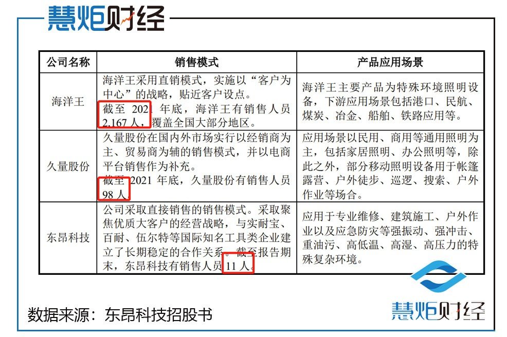招股书显示,报告期内,公司销售费用分别为 733.83 万元、476.77 万元、628.79 万 元和 325.47 万元。截至报告期末,共有销售人员 11 人,而对比可比公司,截至 2021 年底,海洋王有销售人员 2,167 人,久量股份有销售人员 98 人。东昂科技销售人员不及海洋王销售人员的零头。