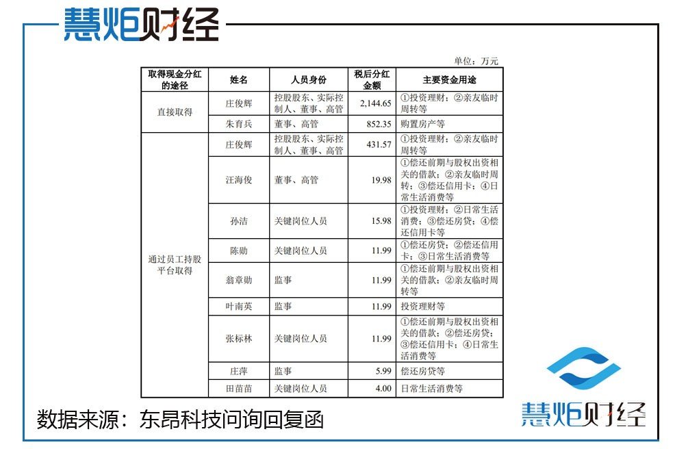 东昂科技表示,实际控制人庄俊辉取得的分红款主要用于投资理财、亲友临时周转等,其关联方东昂投资取得的上述分红款分配给合伙人后,合伙人主要用于:1、投资理财;2、日常生活消费;3、偿还信用卡;4、偿还前期与股权 出资相关的借款;5、偿还房贷;6、亲友临时周转等。