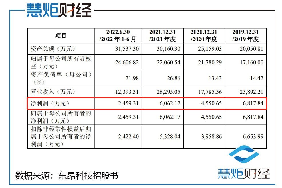 2019年-2021年以及2022年上半年,东昂科技营业收入分别为2.39亿元、1.78亿元、2.63亿元、1.24亿元,净利润分别为6817.84万元、4550.65万元、6062.17万元、2459.31万元。