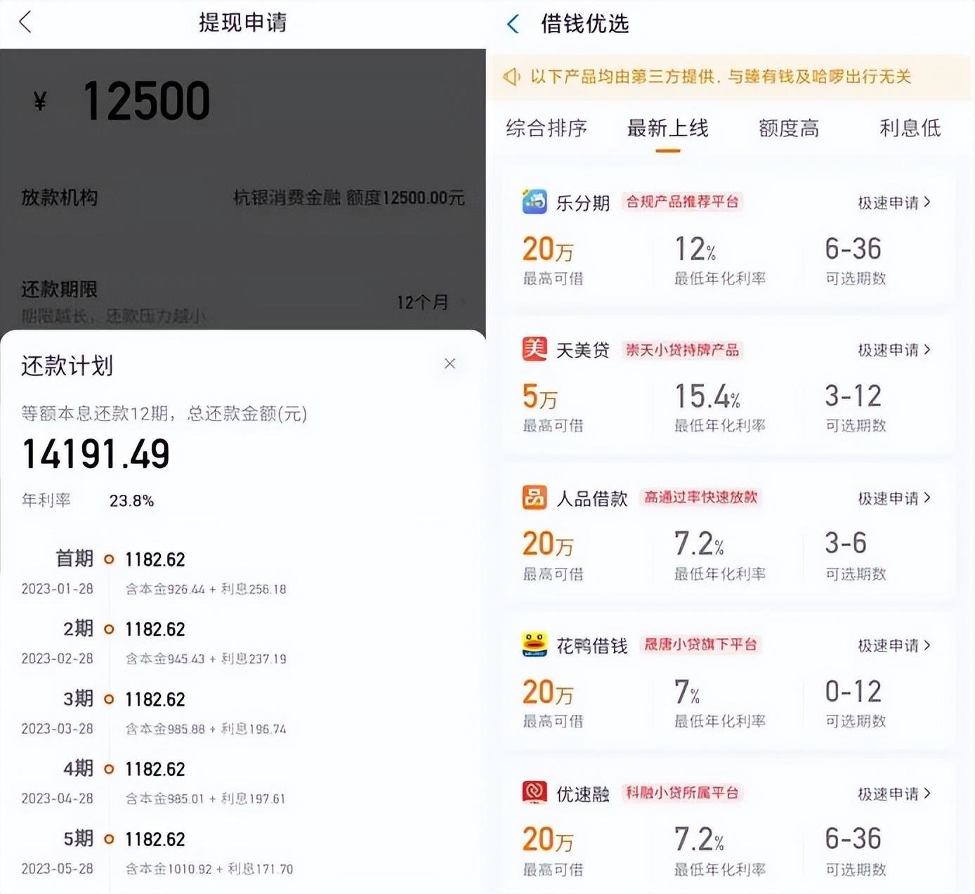 小编尝试在哈罗臻有钱申请提现,页面能显示最多能提现12500元,放款机构为杭银消费金融,分12期,每期还款1182.62元,总额年化利率23.8%。