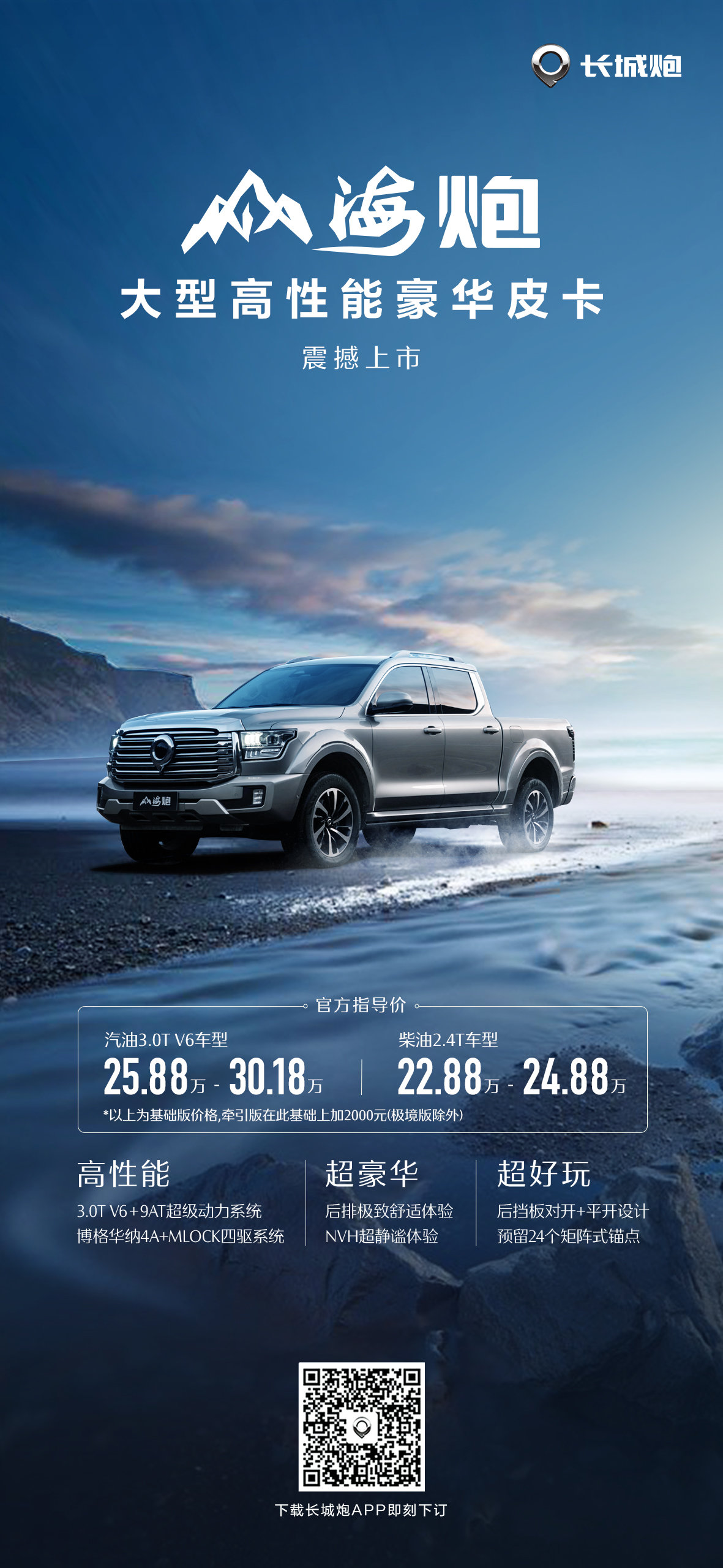 12月30日,长城在2022广州车展上正式发布了旗下首款大型皮卡山海炮,新车同步开启上市,共推出5款车型,售价区间为22.88万-30.18万。新车跟坦克500同平台,动力方面搭载3.0T V6双增压发动机,最大功率260kW,最大扭矩500N•m。同时也提供2.4T柴油动力可选,传动匹配9AT变速箱。