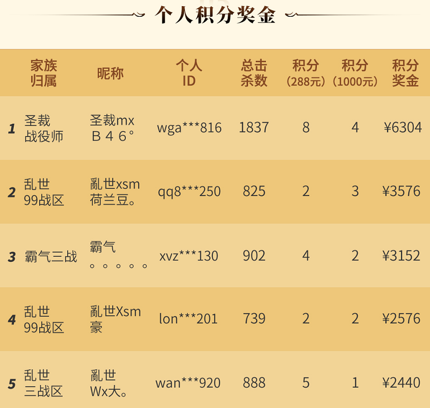 除了奖杯与荣誉外,对所有参战的选手们来说,更让他们开心的是这次比赛的丰厚奖励。996传奇家族全国争霸赛从11月宣布报名开启时,关于比赛的高额现金奖励就一直是玩家们热议的焦点:接近200万的总奖金被分为团队排名、团队积分、指挥排名、个人积分、成员参与等几个奖金池,按照比赛的规则,即使团队的排名不尽如人意,发挥优秀的选手也有机会拿到四位数的个人奖金;而团队排名的奖励更让人跃跃欲试,只要能打进32强的小组赛,就必然会拿到一份奖励,可谓参与即有收获。