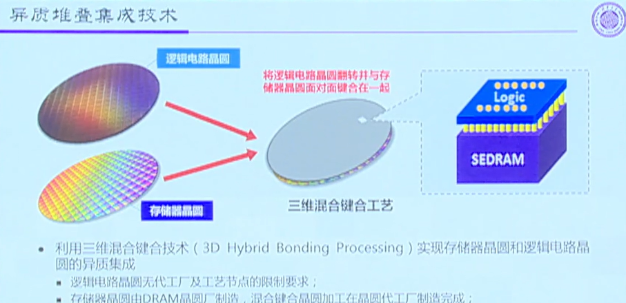 以三维混合键合工艺为例,其就是把一个逻辑晶圆跟一个存储晶圆面对面地键合到一起然后切开,这样得到的一颗芯片是由两颗芯片面对面键合到一起形成的,实现存储芯片和逻辑芯片的异质集成。