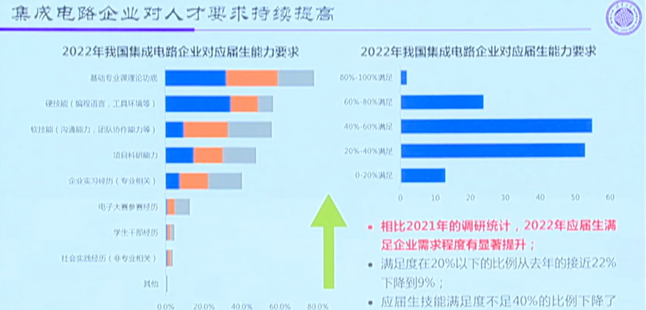 魏少军表示,虽然集成电路企业对人才能力的满意度在提升,但是绝大部分仍不那么满意。我们的高校经常觉得我们培养的人才很不错,但在企业看来,做的还远远不够,很多不是企业所需要的。