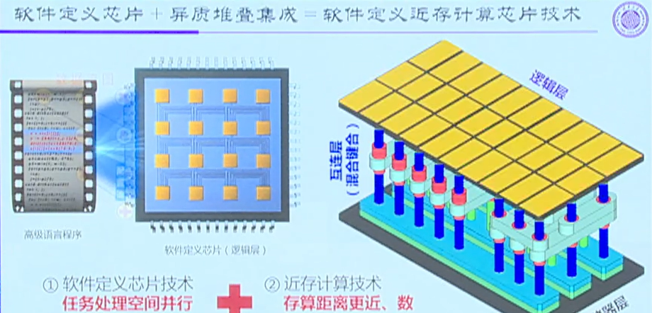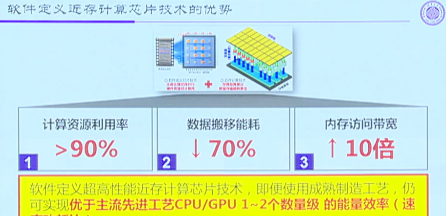 “我们做得比美国早,我们在十几年前就提出这个方法。如果把这个方法跟我们的刚才讲到的混合键合技术实施起来放在一起,结果就创造了一个新的近存计算技术。存储跟计算不通过外围的接口两个变得很近,这个近存计算资源利用率大于90%,数据搬运功耗下降了70%,内存访问的带宽增加了10倍。这将使得我们用成熟工艺也可以达到比主流工艺还要高一到两个数量级的计算能效。”魏少军教授强调:“计算能效很重要,超级计算机如果计算能效不高,功耗将是巨大的。”