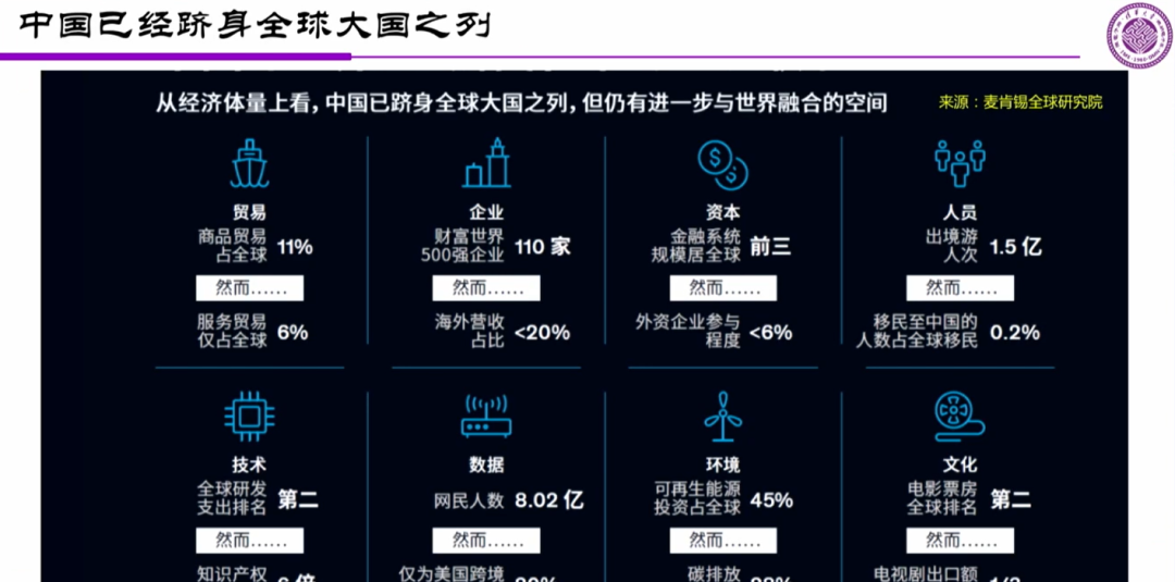 不过,魏少军教授也指出,虽然从经济体量上来看,中国已经跻身全球大国之列,但仍有进一步与世界融合的空间。比如,中国的商品贸易虽然已占全球11%,但服务贸易仅占全球6%;全球500强企业中国110家,但海外营收占比却平均小于20%;中国的金融系统规模居全球前三,但外企参与度小于6%;中国研发支出排名全球第二,但知识产权进口比出口多6倍……
