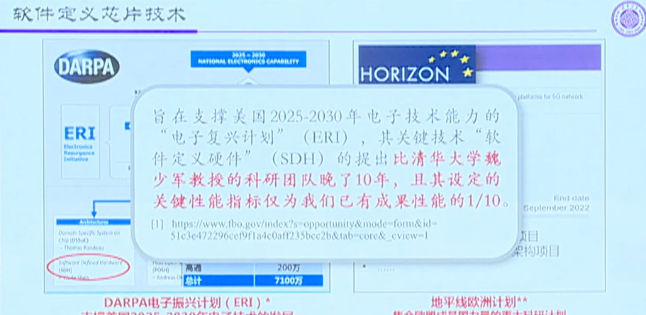 魏少军教授又“软件定义芯片技术”为例介绍称,美国在过去的几年在实施电子振兴计划,就在推动软件定硬件,花了7000多万美元调动了十几家单位,几所大学、众多大公司来做,但最终结果却并没有中国做的好。