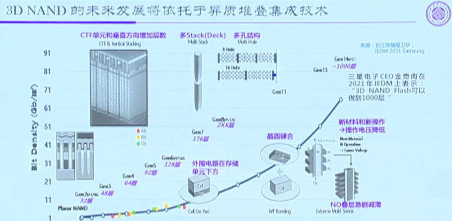 魏少军教授表示:“虽然看上去,长存的两片晶圆绑定在一起的架构似乎成本更高,CUA架构成本似乎更低,但是当NAND堆叠达到300层以上的时候,就会发现这个把外围电路放在底下再去生长的过程,堆叠层数越多越难,成品率很低,最后还是要学长存。三星这样的大厂也明确了如果用长这样的方案可以做到1000层。为什么,这次美国要把长存放到实体名单中,因为他看到中国厂商在技术上开始领先。这说明我们在技术路线走对了。”