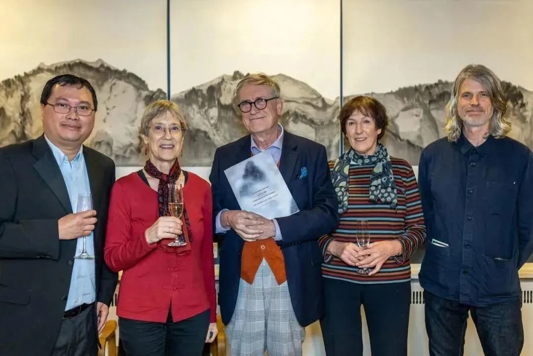 ▲ 剑桥大学克莱尔学堂院长、中华人民共和国教育部特聘专家学者Alan Short教授(中)手持《刘庆伦:他山之石》作品集,与艺委会主席兼英国艺术史学者Frances Spalding教授(右二)、艺委会秘书Fiona Blake博士 (左二) 、特约策展人蔡汶捷博士、以及剑桥画家Church(右一)在刘庆伦当代水墨三联作《他山之石》前合影祝贺