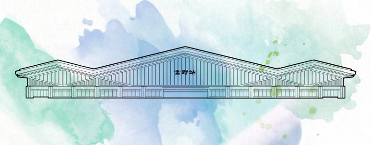 雪野站站房面积约1万平方米,车场规模为 2 站台 4 线,设450×9×1.25m侧式站台2座,清水混凝土有柱雨棚,12m宽进、出站合用地道。站房主体建筑提取了延绵起伏的山水意象和水波纹的自然意境,顶棚最高处超过28米,形态抽象为“山”字的符号,呈现出富有韵律、轻盈灵动的建筑形体,巧妙地体现了“水光潋滟晴方好,山色空蒙雨亦奇”的自然意象,与重峦叠嶂的自然背景巧妙地结合在一体,犹如一幅山水画卷,彰显出雪野的仙境神韵。