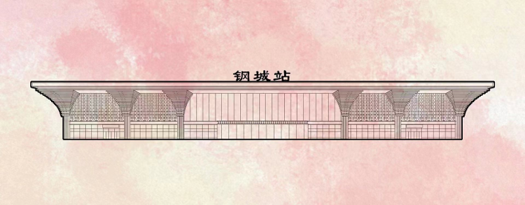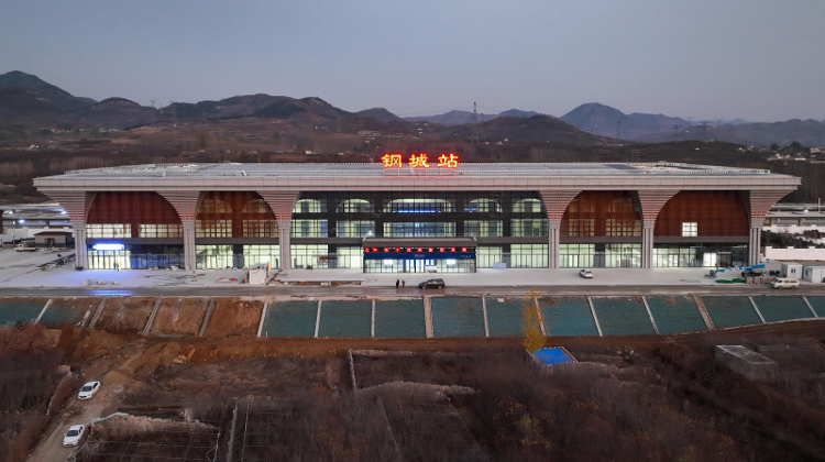 钢城站位于钢城区主城区东部,距钢城区最重要的产业中心莱钢产业区3.2km。钢城站站房面积约1万平方米,车场规模为2台4线,设450×9×1.25m侧式站台2座,清水混凝土有柱雨棚,12m宽进、出站合用地道。站房设计以富有张力的伞状钢结构造型,结合力量感厚重的钢铁巨柱,支撑出挑的钢结构屋檐,简洁大方的巨柱撑起层层出挑的屋檐,彰显气势雄浑、刚劲有力的建筑形象。