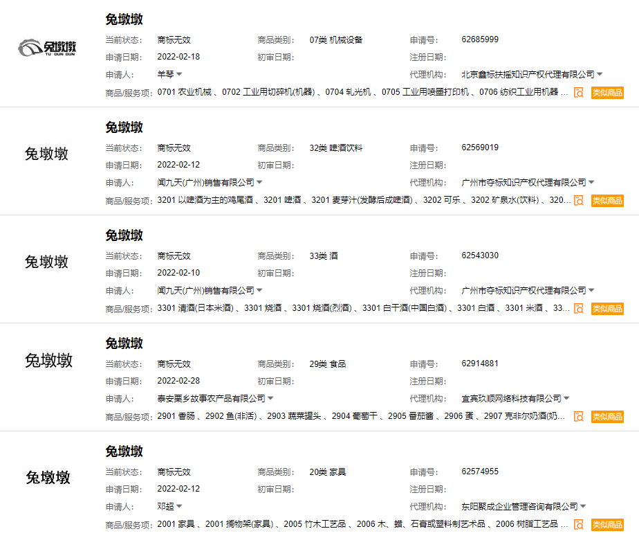 不过,据十象知产了解,早在“兔墩墩”产品出现之前,该商标就已被多家公司及个人申请注册,申请时间均为2月份,国际分类包括食品、家具、科学仪器等。商标申请信息共计8条,目前商标状态均为“驳回待复审”。