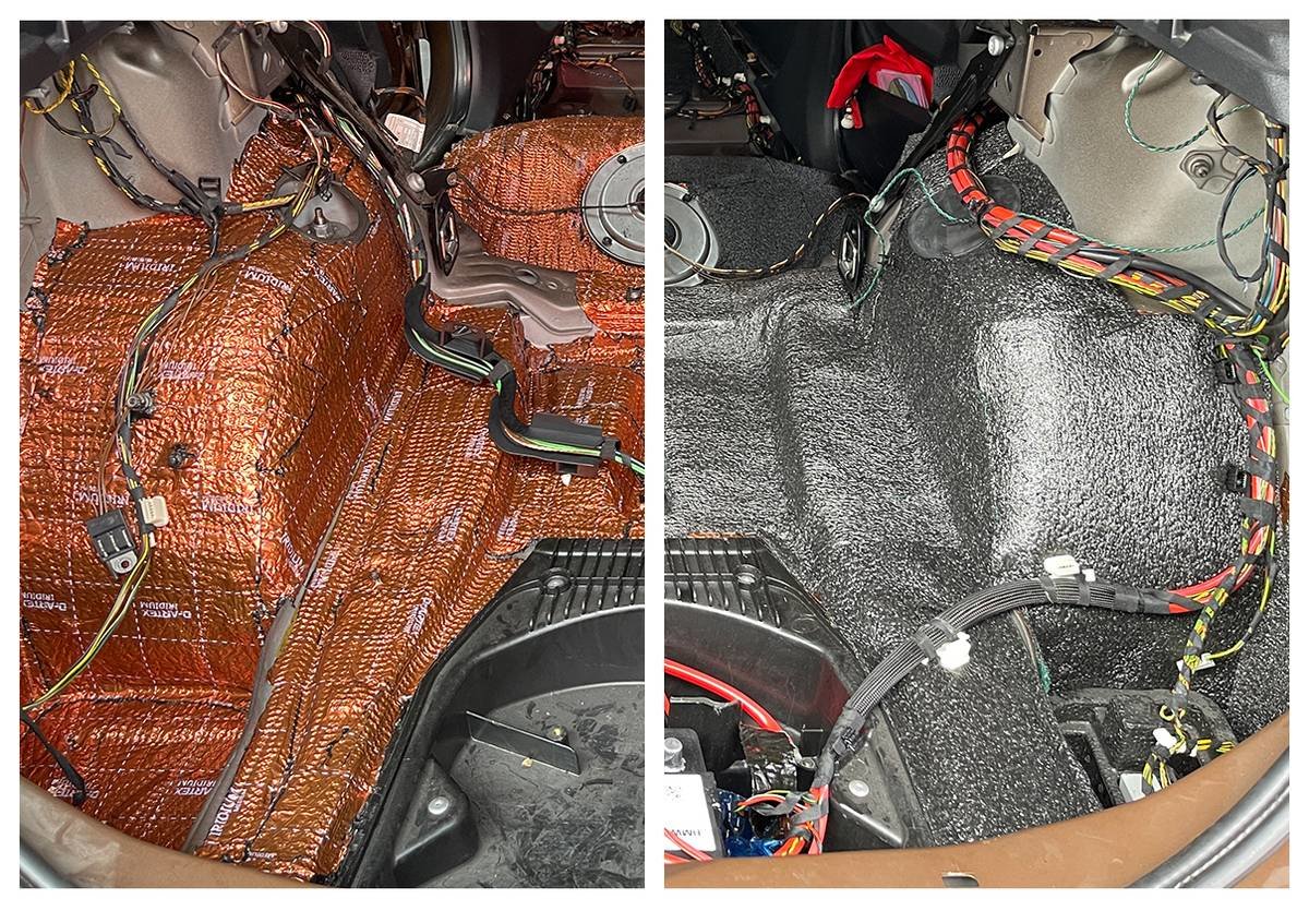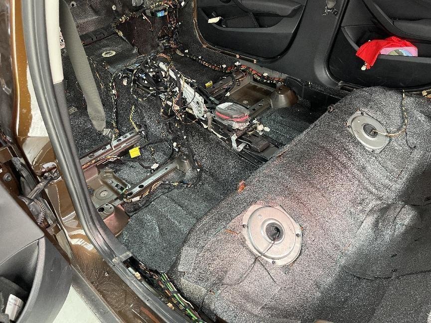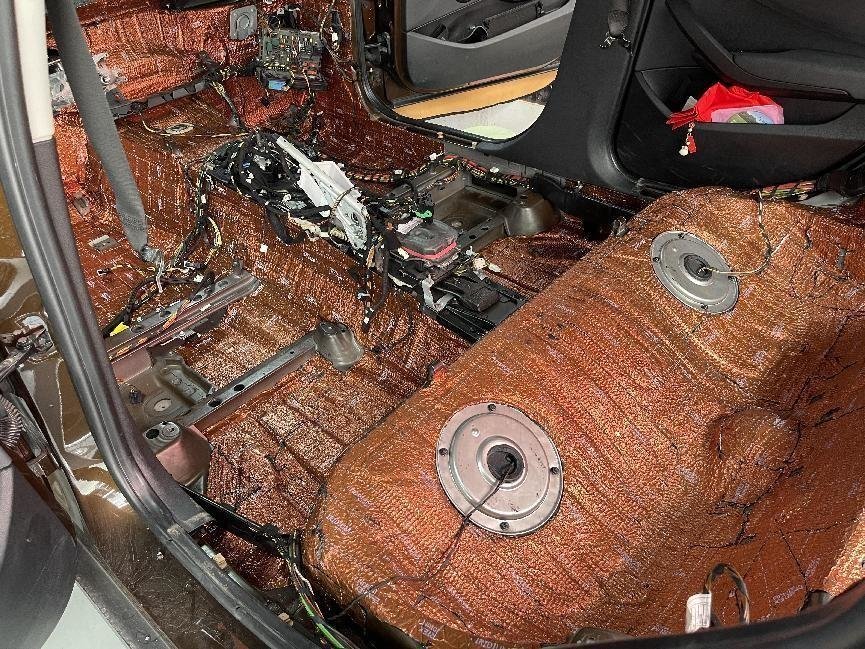 车地板和后尾箱是减少胎噪、路噪、低频噪音与共振传导等的重要部位,因此将车厢内的座椅和内饰全都拆卸了下来,再用俄罗斯阿德萨的铱甲减振板、超级护甲05隔音棉两种隔音材料,做了双层隔音处理,最大程度的抑制噪音侵入。
