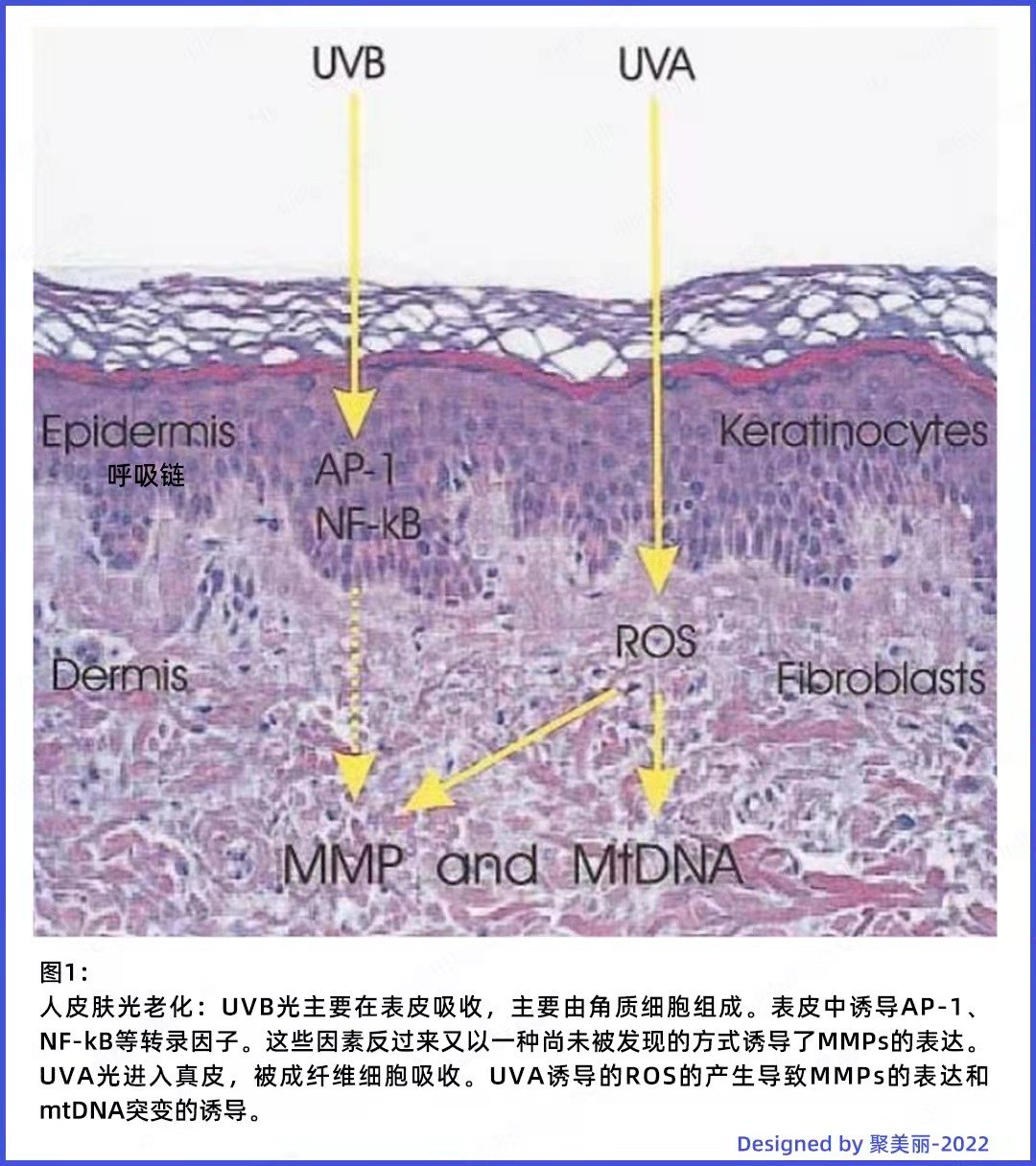 2010年,发表在SCI期刊《光皮肤学,光免疫学与光医学》上的一篇综述中提到,较长波长的紫外光(UVA)穿透较深,可与表皮角质形成细胞和真皮成纤维细胞相互作用,主要通过产生ROS间接发挥作用,随后可产生多种效应,如脂质过氧化、转录因子活化和 DNA 链断裂;而较短波长的紫外光(UVB)则主要影响表皮细胞,即角质形成细胞,其也能够产生ROS,但最主要的作用机制是诱导DNA损伤,与DNA直接作用[6]。