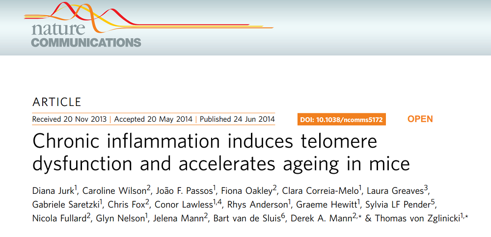 2014年,《自然通讯》上的一篇研究论文描述了炎症触发细胞衰老,释放包括活性氧簇在内的,与衰老过程相关的一些非常强有力的分子的机制,证明了系统性慢性炎症可通过活性氧介导的端粒功能障碍和细胞衰老而加速衰老[13]。
