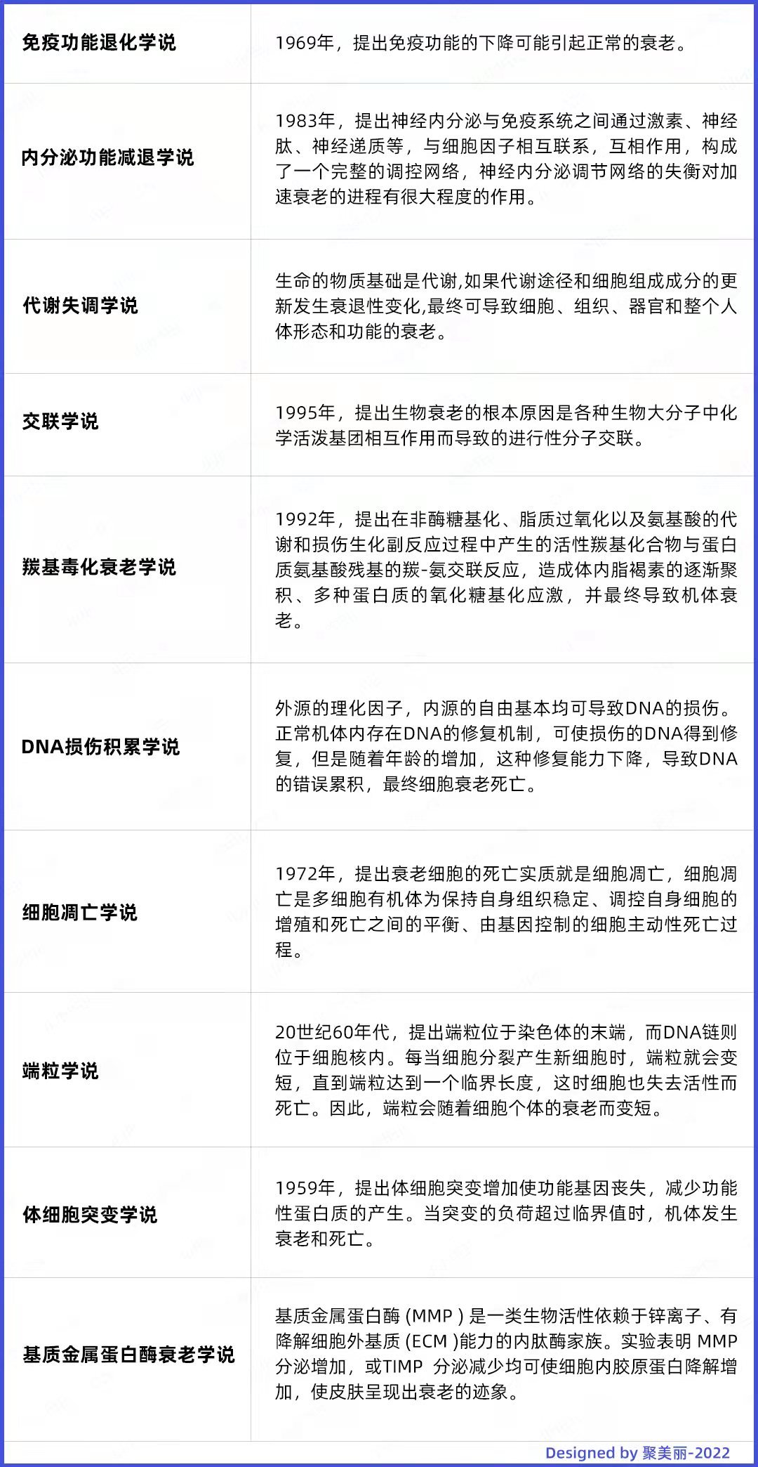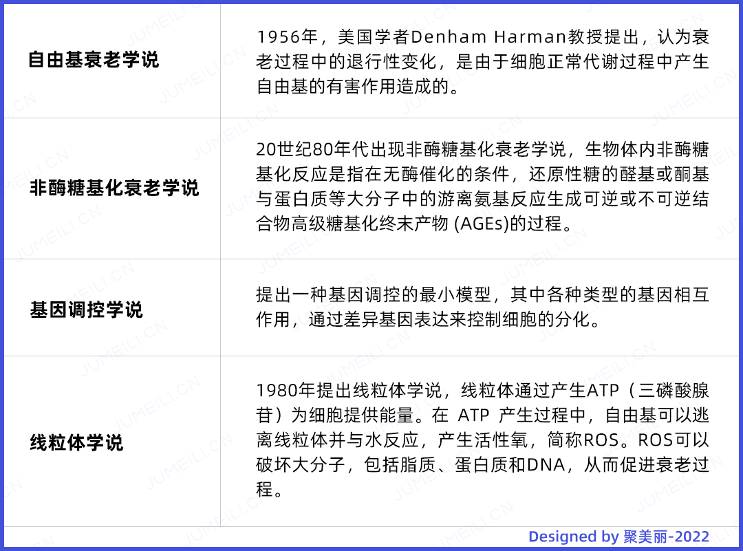 衰老是人体的一种自然规律,人们对衰老的研究并不止步于皮肤衰老,还包括病理性衰老,以及外界环境、情绪、生活作息等因素对身体机能老化造成的影响等。事实上,探索衰老的空间很大,在对衰老机理的不断剖析过程中,科学家们从不同的维度出发,提出了各种不同的衰老理论学说。其中比较具有代表性的有:自由基衰老学说、非酶糖基化衰老学说、基因调控学说、线粒体学说等。
