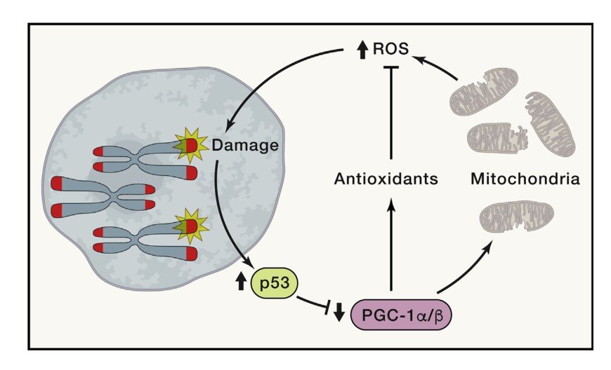 2021年,发表在《Cell》杂志上的一篇文章中提到,端粒几乎与衰老的所有特征都存在内在的相互联系。比如,端粒功能障碍会损害线粒体功能和氧化防御能力,增加ROS水平,构成端粒-p53-PGC1α/β -线粒体的信号传导闭环。此外,端粒功能异常也会影响到组织干细胞耗竭、基因组不稳定、蛋白稳态失衡,甚至会诱导组织炎症反应[10]。