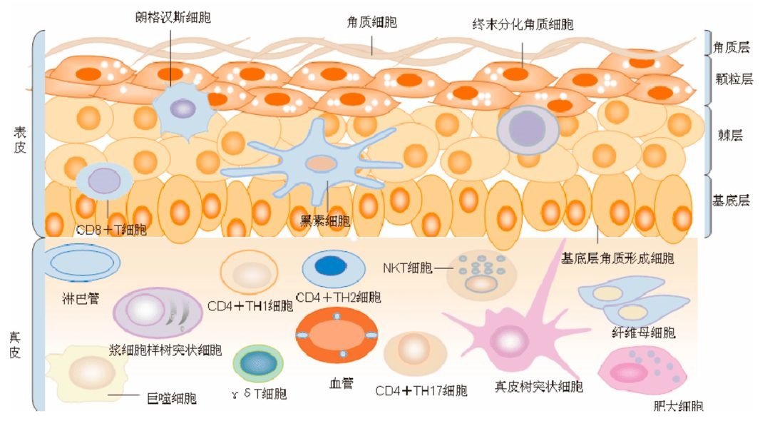 表皮是皮肤的最外层,主要由角质形成细胞和黑素细胞组成。角质形成细胞能够合成角蛋白(即表皮的主要蛋白质结构),并充当激活细胞过程中化学介质的细胞因子。因此,表皮决定了活性物质通过皮肤的迁移深度。